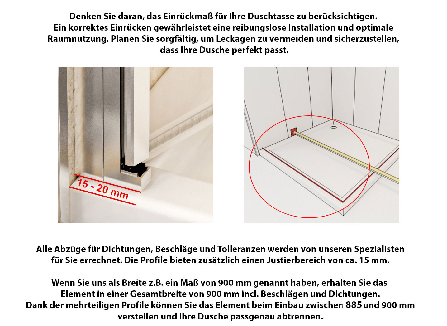 Unsere Experten haben jahrelange Erfahrung im Umgang mit Maßanfertigungen und werden sicherstellen, dass alles perfekt passt. Mit präzisen Anleitungen und Unterstützung bei jedem Schritt werden wir sicherstellen, dass Ihre Duschabtrennung perfekt zu Ihrem Raum passt.