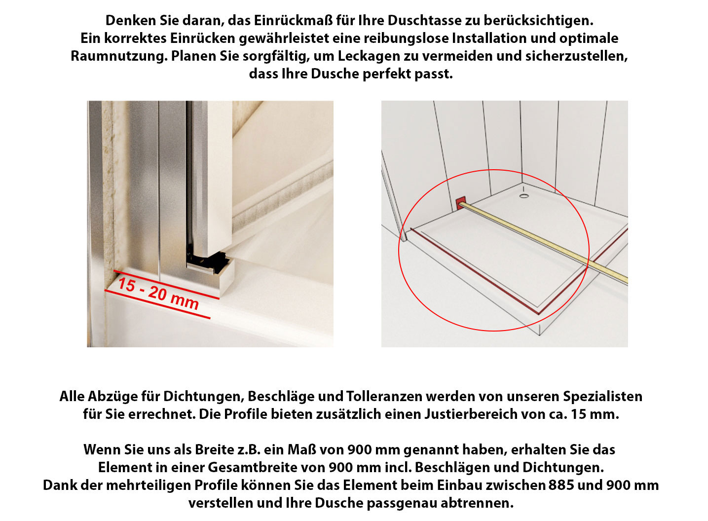 Unsere Experten haben jahrelange Erfahrung im Umgang mit Maßanfertigungen und werden sicherstellen, dass alles perfekt passt. Mit präzisen Anleitungen und Unterstützung bei jedem Schritt werden wir sicherstellen, dass Ihre Duschabtrennung perfekt zu Ihrem Raum passt.